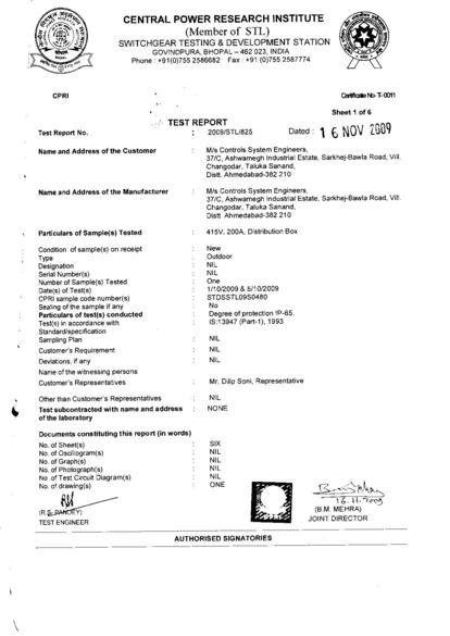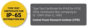 Certificate: Type test certificate for IP-65 for 415V, 200A, distribution box