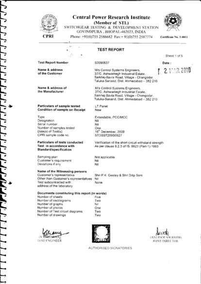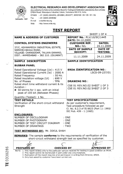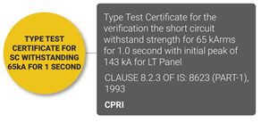 Certificate: Type Test Certificate for the verification of the short circuit withstand strength for 65 kArms for 1.0 second with initial peak of 143 kA for LT Panel