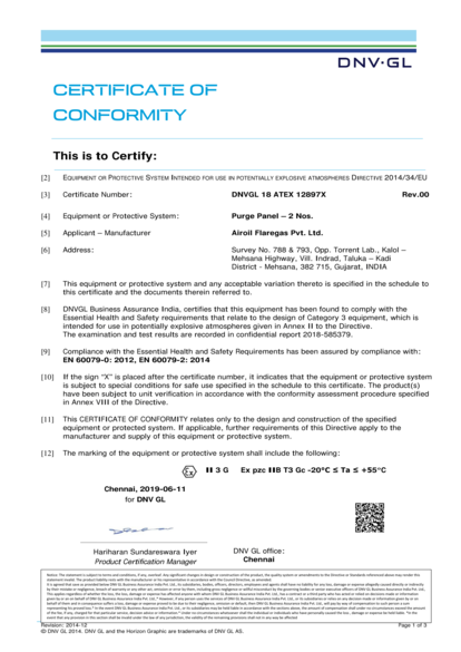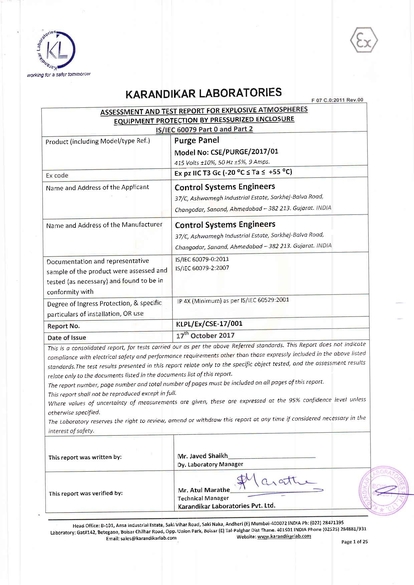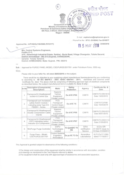 Certificate: CCOE certificate for purge panel for Ex pz IIC T3 Gc