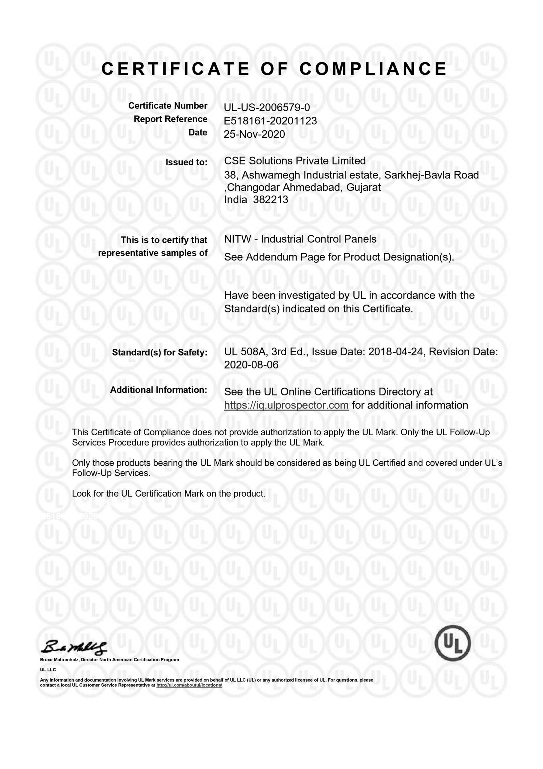 Certificate: UL 508A